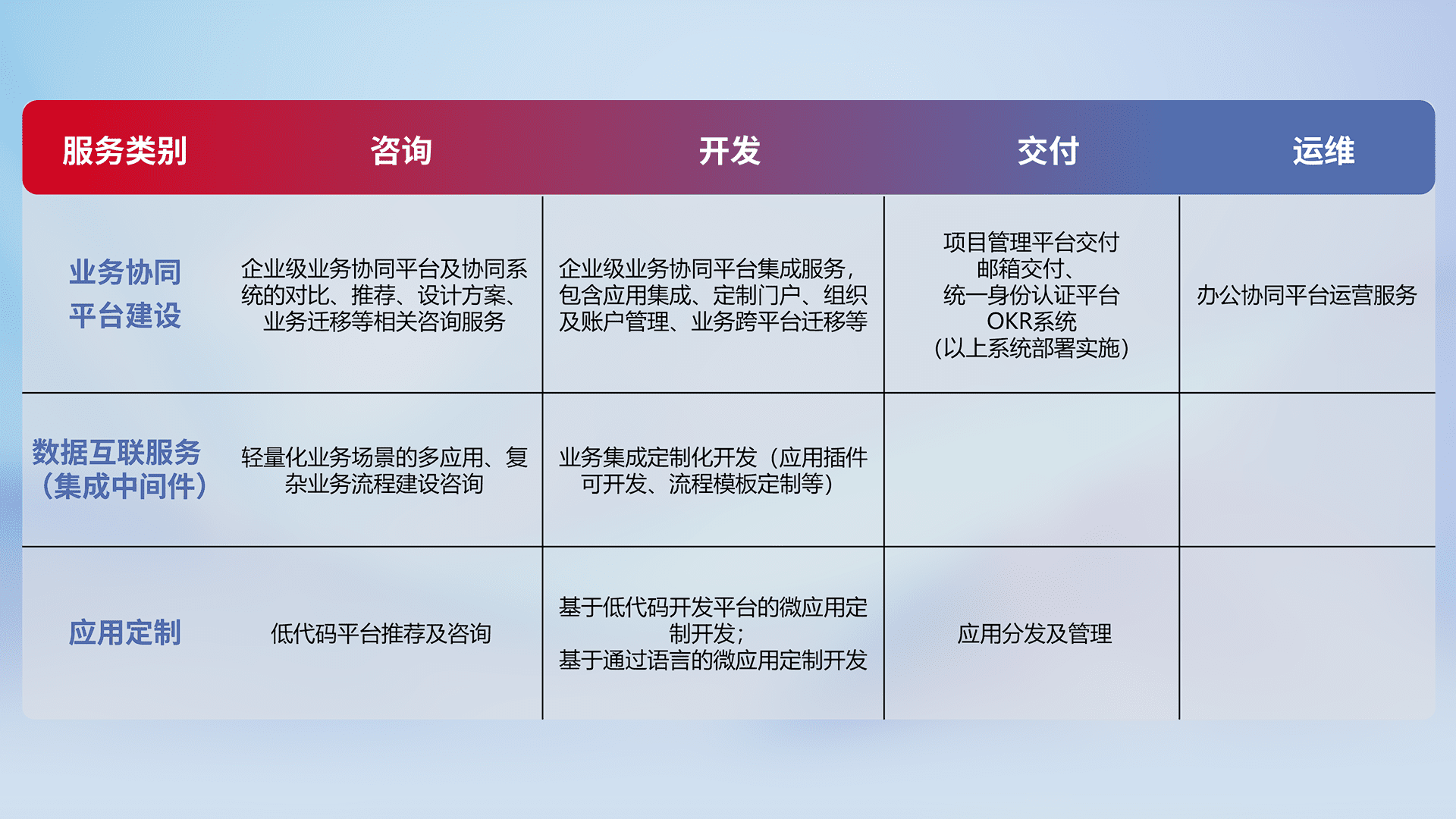 针对钉钉、、、、企微、、、IDaas等平台级产品提供产品的规划、、、方案、、、交付、、、定制化开发等服务,,实现如统一协同办公、、智能客户服务、、、混合会议管理、、、智能数据查询、、等业务场景,,实现数字化转型。。