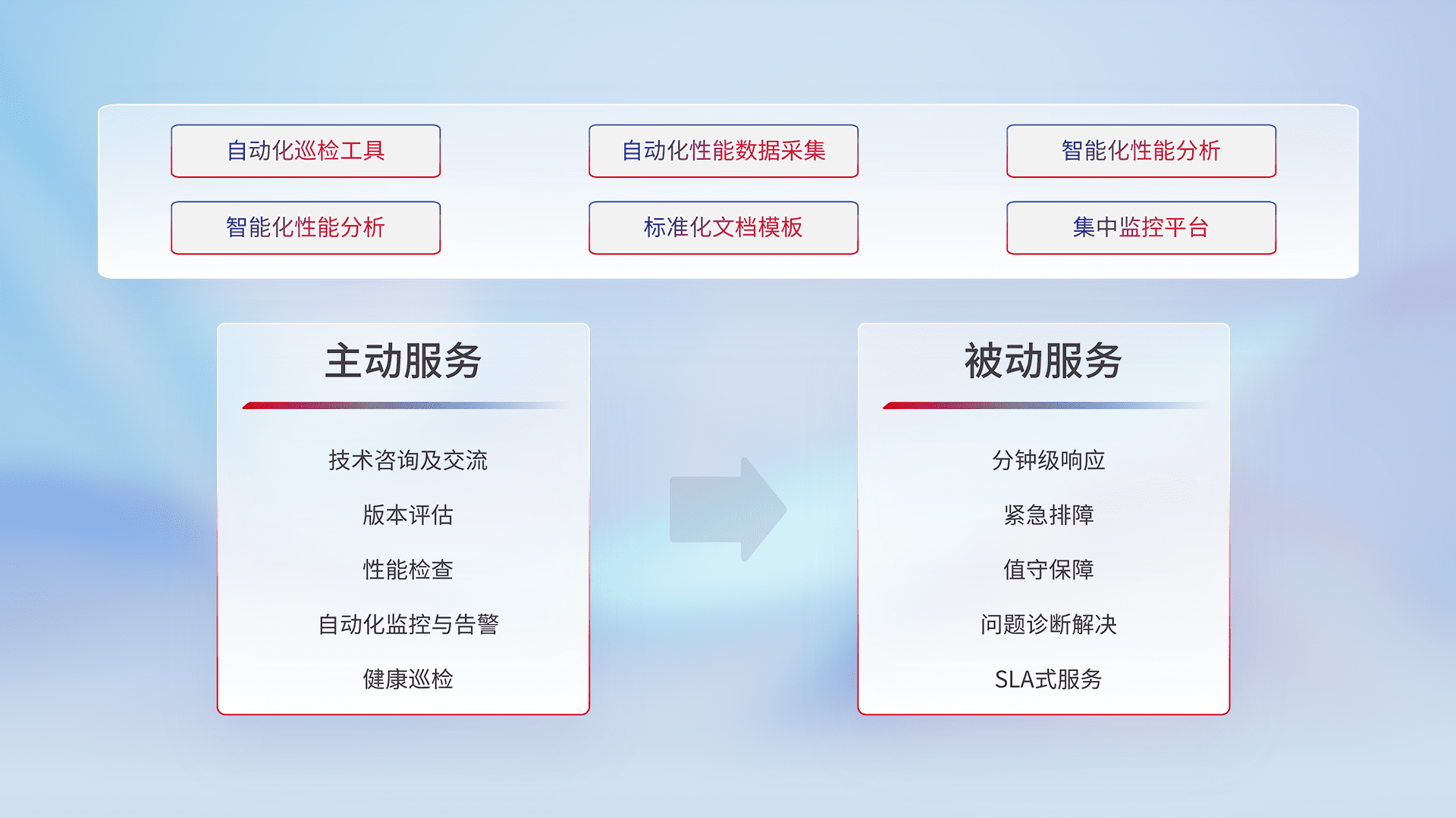 智能化工具和标准化文档,,,,保障服务质量,,,,提供主动服务(包含技术咨询、、、、版本评估、、、性能检查、、、、自动化监控与告警、、健康巡检)和被动服务包含(分钟级响应、、紧急排障、、、值守保障、、、问题诊断解决、、、SLA服务)。。。