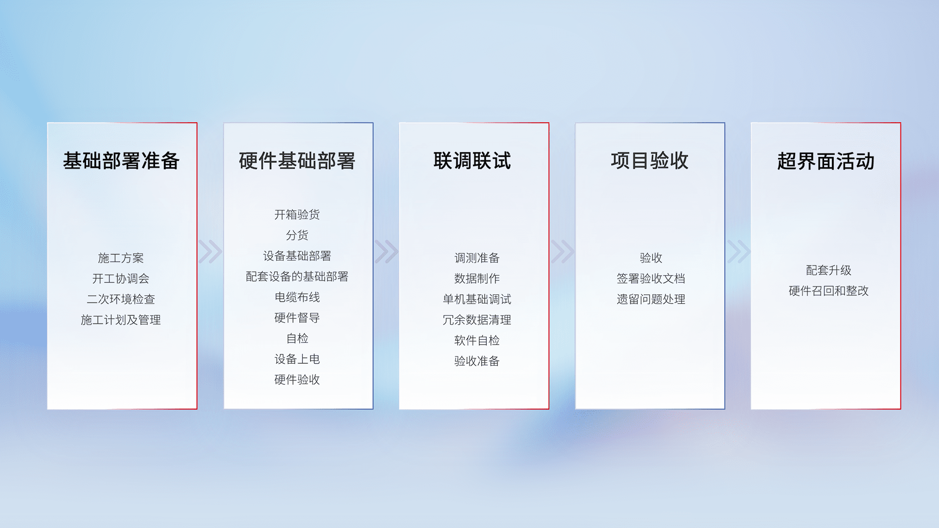 从基础部署准备、、、硬件基础部署、、联调联试、、、、项目验收、、、越界面活动的全过程可追溯,,,,保证施工质量和进度。。。。